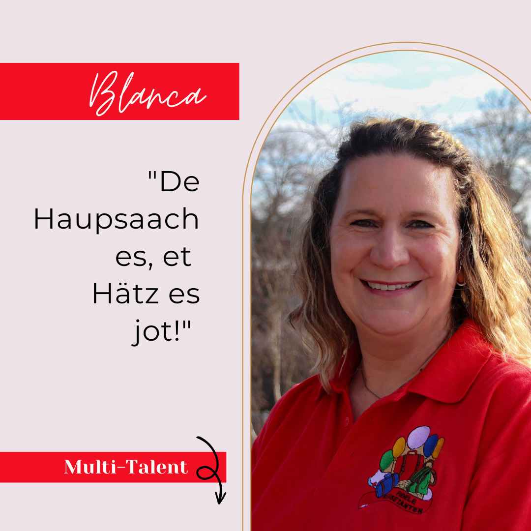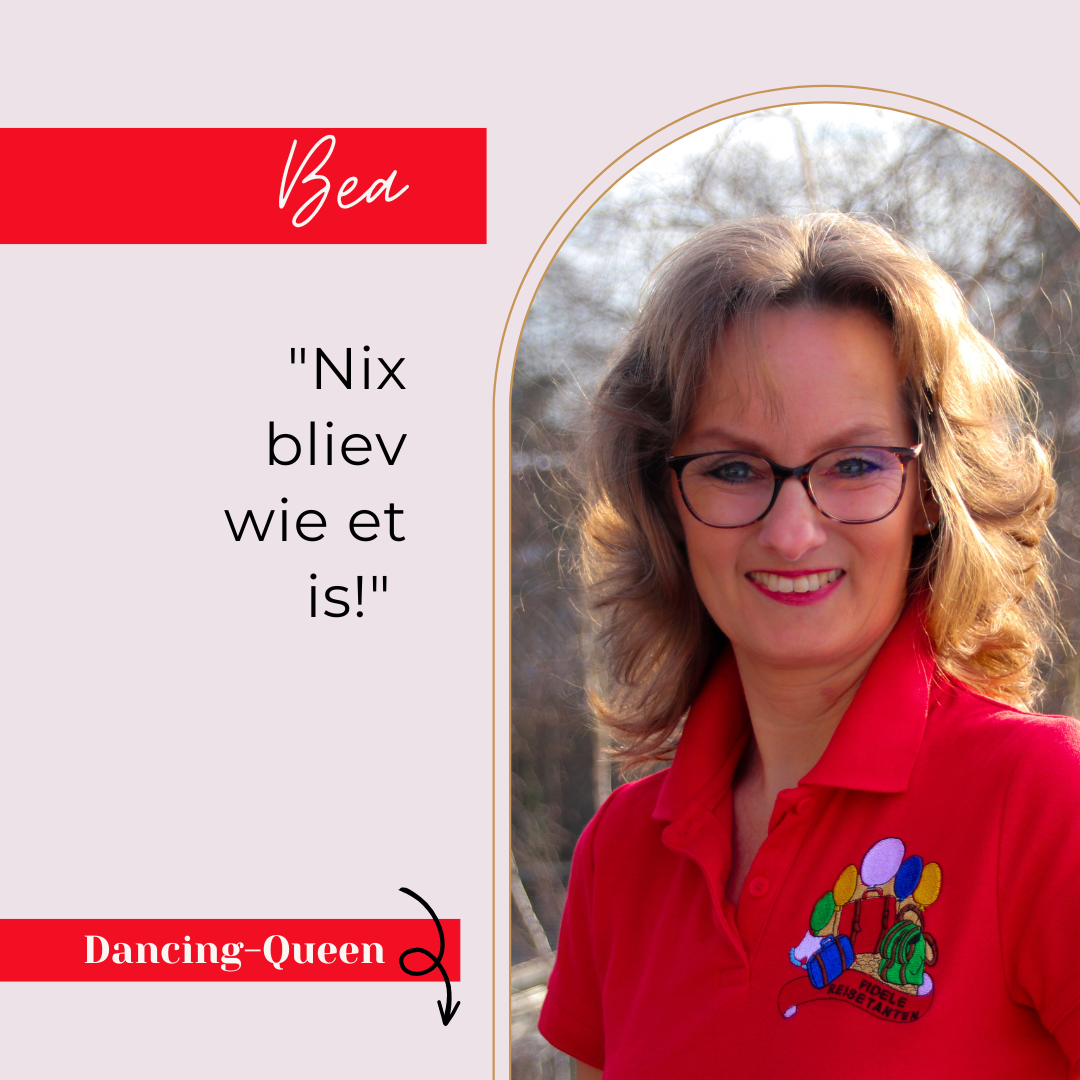 Bea ist Karnevalistin mit Leidenschaft! Sie ist nicht nur eine Fidele Reisetante, sondern auch ein „Poppelsdorfer Schlossmadämchen“ und somit gleich in zwei karnevalistischen Vereinen aktiv.