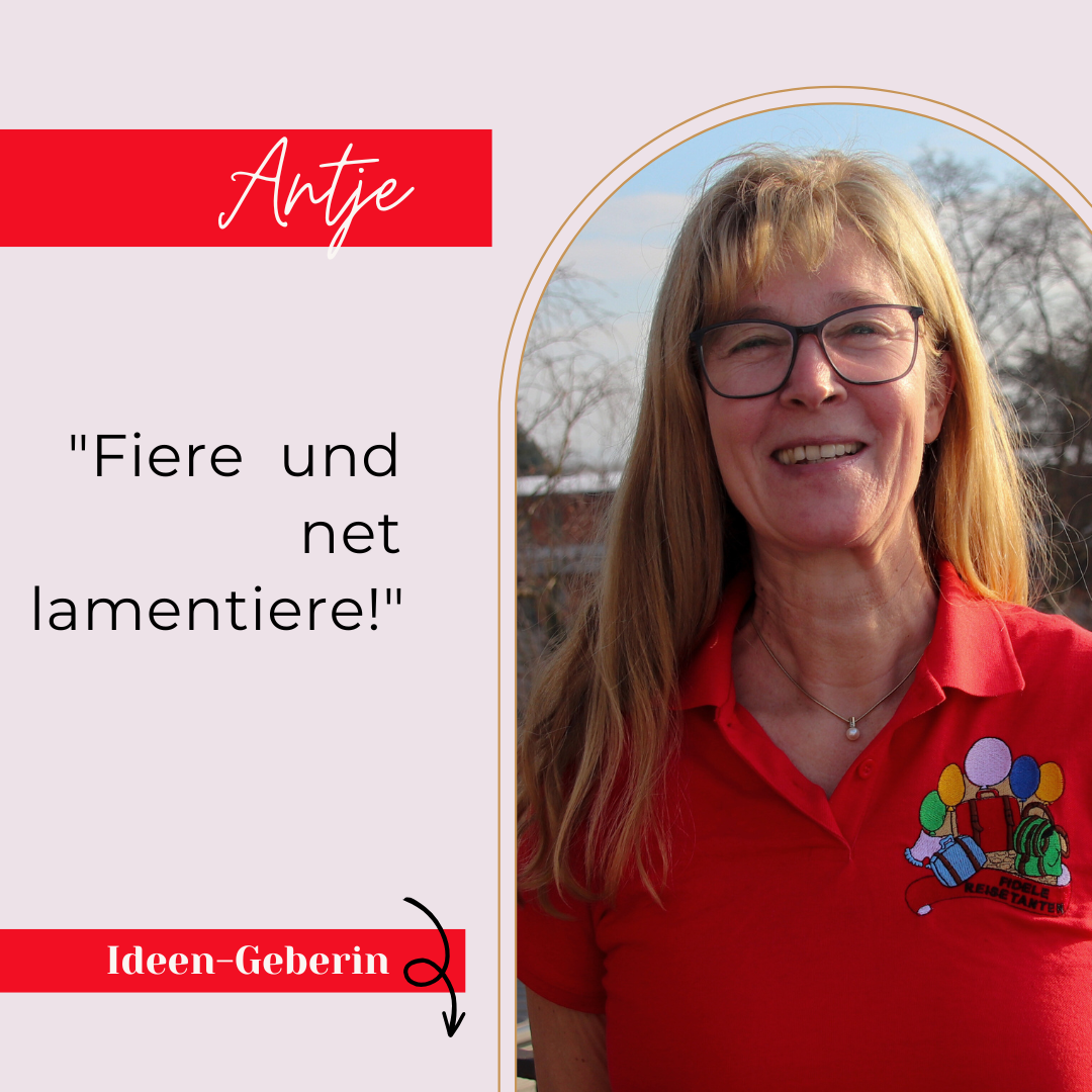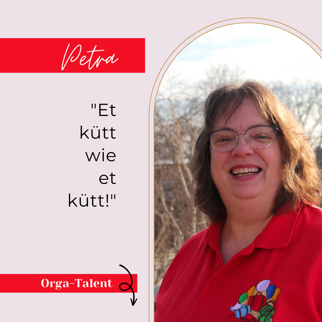 Petra ist unsere gute Seele, die immer einen Lösungsvorschlag parat hat und auch unser Organisationstalent. Und das zeigt sie permanent als Mitglied der Fidelen Reisetanten: Sie organisiert unter anderem Räume, in denen wir unsere Bühnen- und Saaldeko malen können, den gemütlichen Grillplatz beim THW, wo wir unser jährliches Sommertreffen feiern können, managed mit Heike den Kartenvorverkauf und kümmert sich um die Verpflegung der Reisetanten.