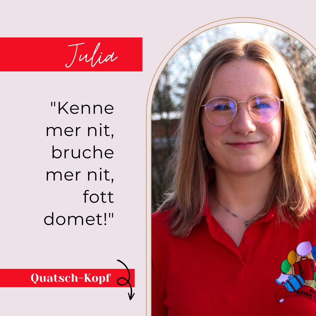 Julia tanzt wahnsinnig gerne und ist für jede Tanz-Choreographie zu haben und vorne mit dabei. Aber vor allem ist unser Julchen als Quatschkopf der Truppe bekannt: Sie schlüpft in die verrücktesten und ulkigsten Rollen, die sie immer mit viel Humor darstellt. Sie sagt selbst, dass sie sich gerne selber zum Affen macht – und der Saal dankt es ihr mit tosendem Applaus.